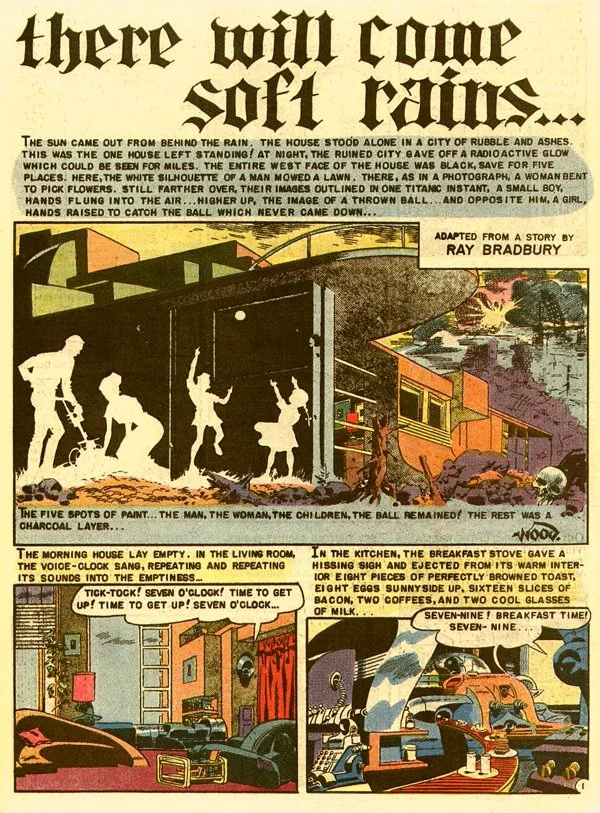 Squa Tront is also the name of a fanzine that pays homage to 1950s-era EC Comics, a publisher that emerged in the 1940s. The fact that the fanzine is still published almost half a century after its inception is a tribute to the amazement and wonder the EC line evoked in its young readers, and to the deep devotion it inspired. One look at Weird Fantasy #17 proves that this wasn’t normal funny pages fare, especially in 1953. Adults had barely come to terms with nuclear weaponry, and yet the publisher had already released the aforementioned “The Aliens,” EC’s mind-bending, meta-narrative morality fable for kids. That issue also contained three other dramatically downbeat tales, including an adaptation of Ray Bradbury’s apocalyptic “There Will Come Soft Rains.”