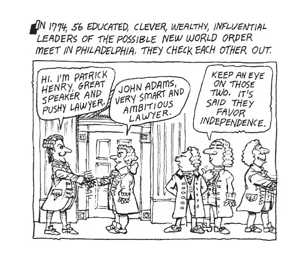 Editorially, they are a lot alike. I am very careful to triple-check my historical facts and motivations—not that original documents necessarily agree with each other in the first place. In both books the fun came when I was able to put words into the mouths of some of the greatest names in history: George Washington, Alexander Hamilton, and John Adams, not to mention Moses and the God of the Jews. The books being the work of a cartoonist, they do all kinda speak out of the side of their mouth, wiseguy-style. Waddaya expect?